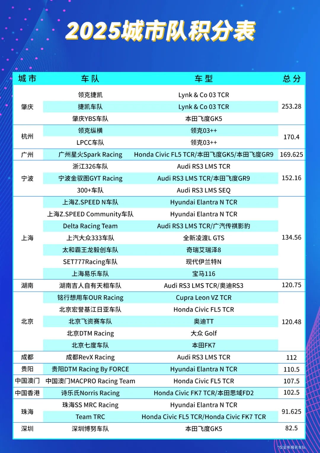 历经全年六大分站的激烈角逐,CTCC 2025赛季城市战队积分榜最终排名正式揭晓。
