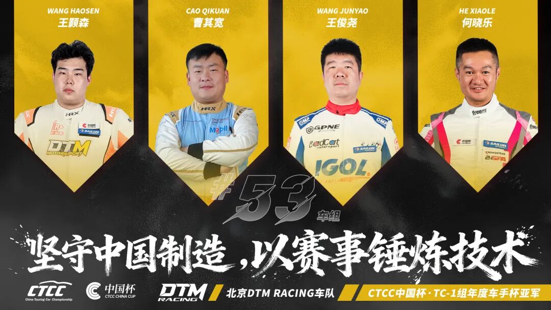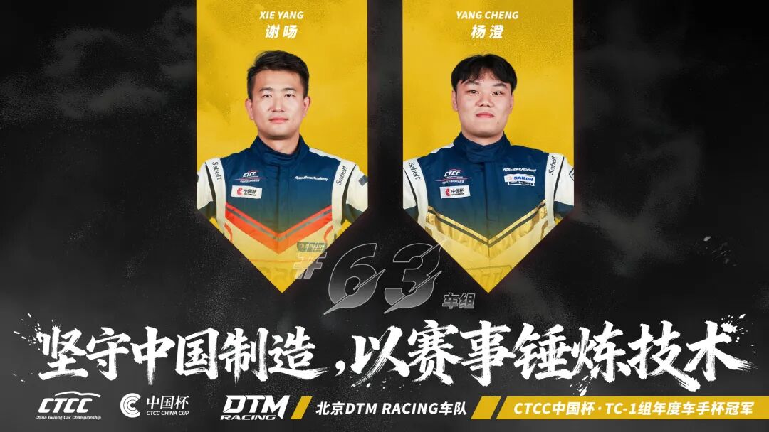 上海嘉定揭幕战,焕新升级的CTCC中国杯,参赛阵容空前庞大,超过30台赛车同场角逐。北京DTM Racing 63号车组谢旸/杨澄在竞争白热化的第一回合正赛中稳扎稳打,以TC1组别第六名完赛。第二回合正赛,两位车手展现神勇状态,一举斩获组别亚军,登上颁奖台。53号车组虽因意外状况未能取得理想名次,但仍在赛中展现出色速度潜力。