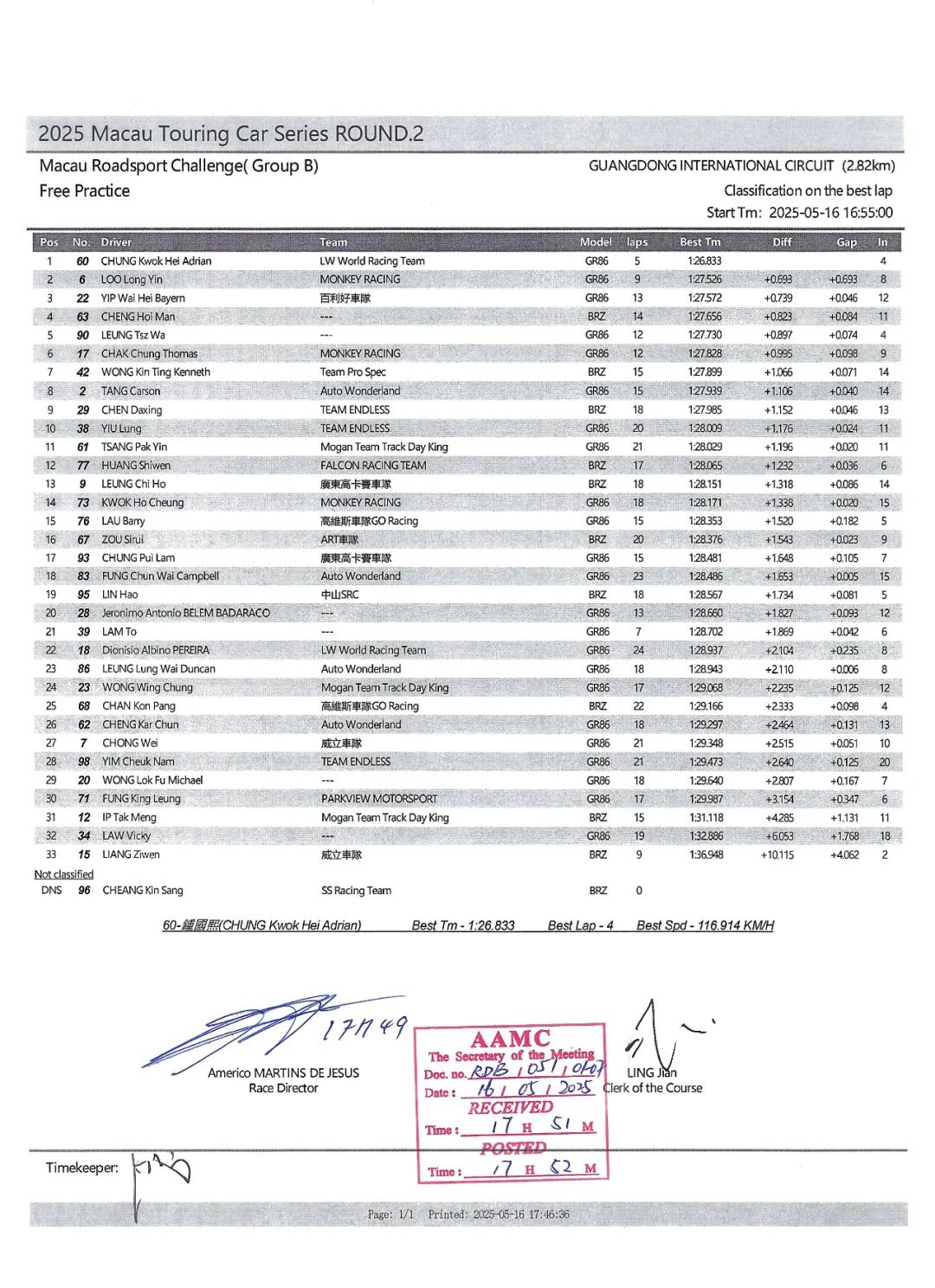 B组,LW World Racing Team钟国熙以1:26.833的最快圈速领跑全场。MONKEY Racing车手路朗然位居第二,百利好车队叶怀希排名第三,距路朗然仅有0.046秒差距。
