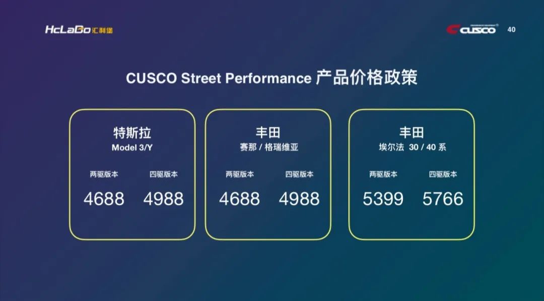 目前该系列适配特斯拉Model 3、ModelY、丰田塞纳、格瑞维亚、阿尔法(30/40系)等车型,以后将逐步开发更多的新车型型号。售价控制在“4000-6000元”区间。更值得期待的是,Cusco还即将推出“手机可调版本”,通过手机APP无线调节减震器软硬,进一步降低用户操作门槛。