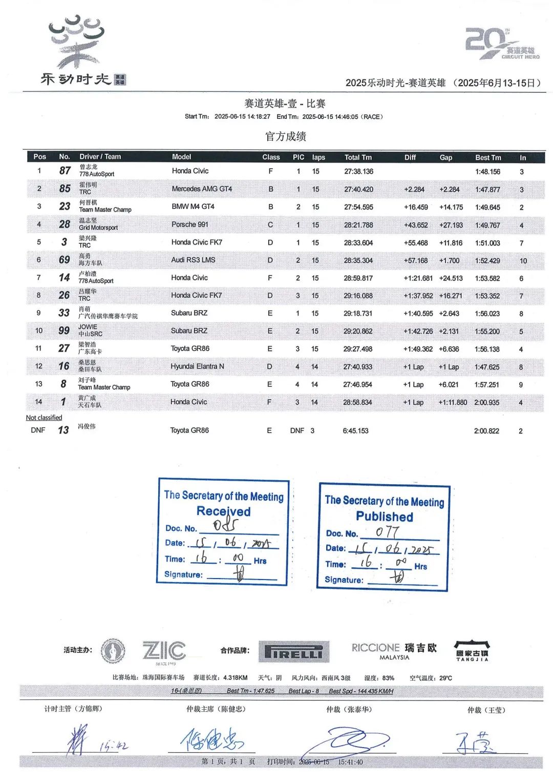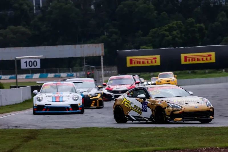赛道英雄-壹的战斗在官方指定轮胎倍耐力的助力下打响。杆位发车的曾志龙在起步后守住领先并迅速带开。第二排发车的霍伟明冲至全场第二,何晋棋以全场第三向前推进。