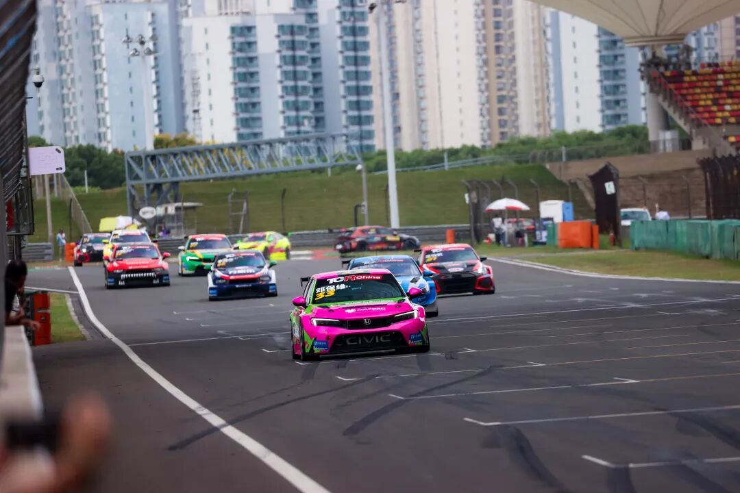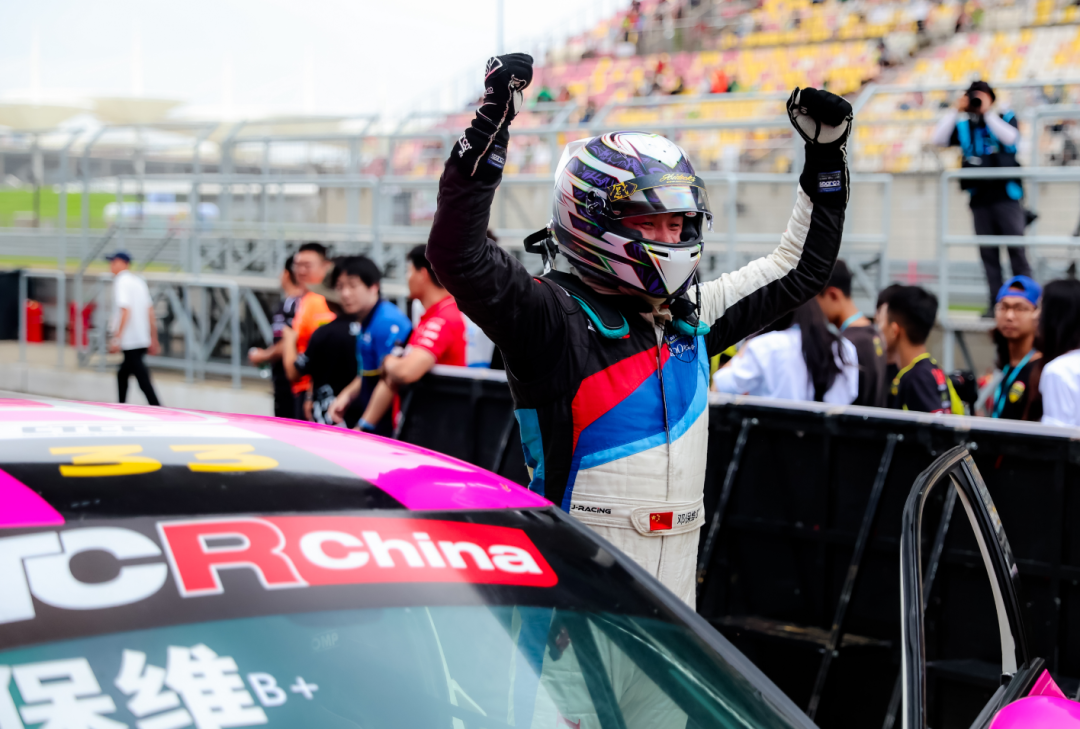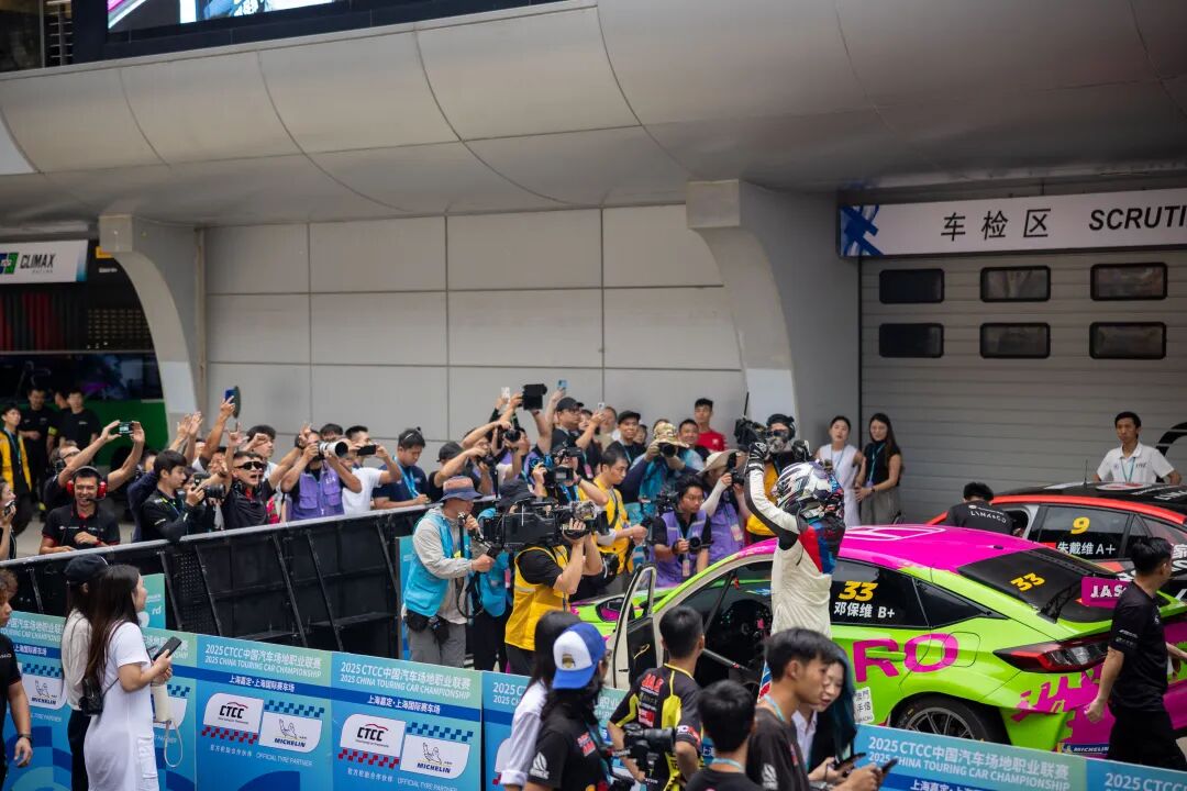 在关键时刻,领先车手之间的碰撞改变了比赛走向,邓保维凭借稳健的节奏顺势上到全场第一,并在随后的数圈中展现出极高的专注度和控制力。面对身后对手的紧追不舍,邓保维顶住压力,最终率先冲过终点线,成功拿下全场冠军。这一突破不仅刷新了个人纪录,也成为今年CTCC·TCR China中首位击败PRO(专业组)车手斩获全场冠军的AM(挑战组)车手。