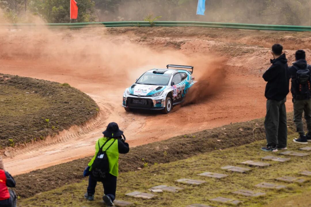 首个赛段随即于华家班赛车公园短道赛段开启,Team Pegasus星速车队麾下的拉力名将林德伟/刘田杨车组率先发力,驾驭首秀国内赛场的Toyota GR Yaris Rally2战车跑出1:35.2的标杆成绩,斩获赛段胜利。
