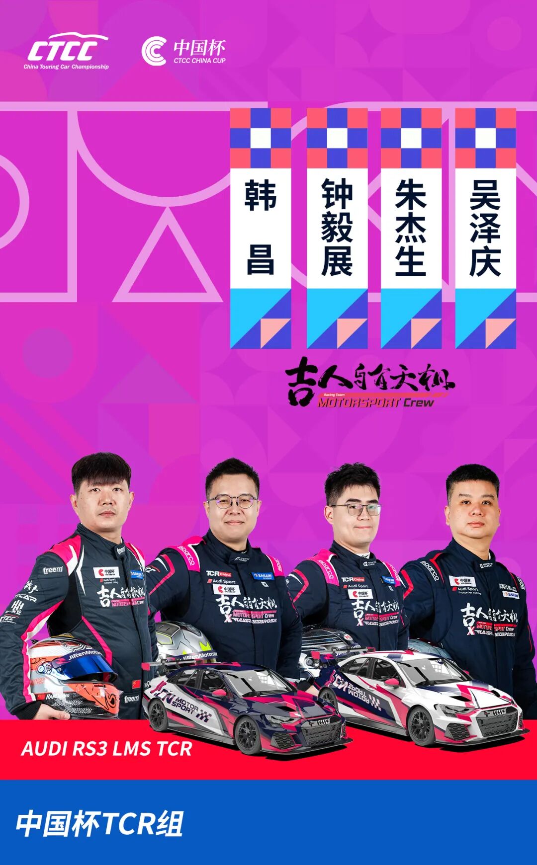 在CTCC中国杯TCR组,韩昌、钟毅展以及朱杰生/吴泽庆车组将分别驾驶三辆奥迪TCR赛车,在长距离赛事中积累里程、提升自我,他们也是车队“以老带新”体系中的中坚力量。