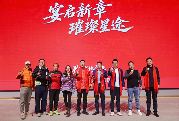 两位领导致辞后,所有高层领导共同上台,为家宴举杯祝酒。