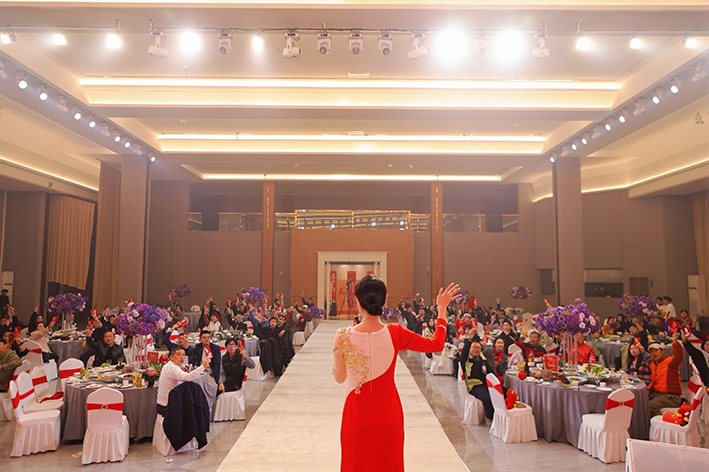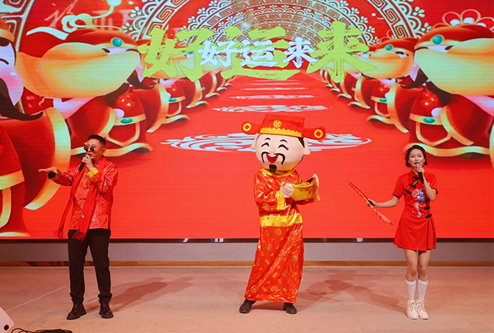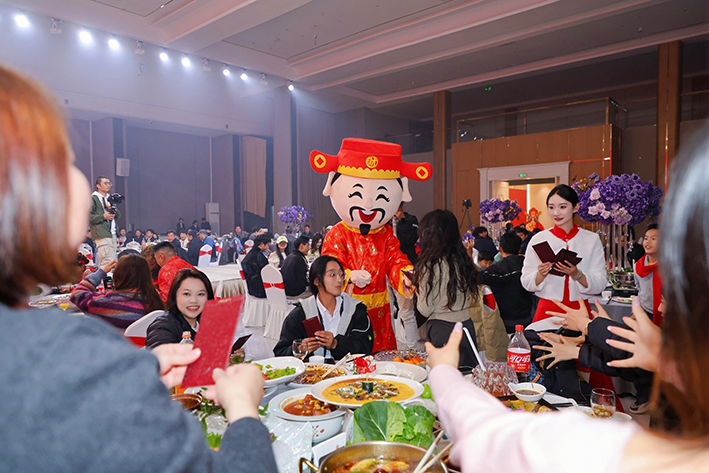 晚宴的高潮环节是现金抽奖。财神闪亮登场,走到每一桌抽取现金红包,将现场气氛推向顶点。"