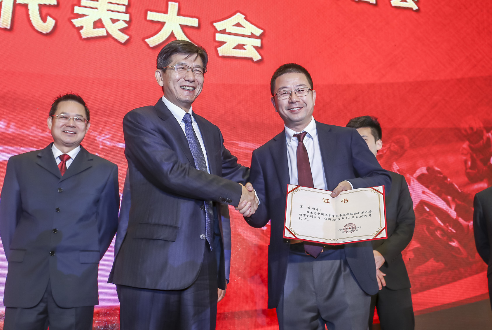 在本次年会上,还进行了中汽摩联换届改选,詹郭军同志当选为中国汽车摩托车运动联合会主席,林洁、万和平、冯潮、王延奎、冯湘江、王小康、陈立基、朱玲、秦志浩、杨卫、师建华、高和生、魏志玲、夏青、姜澜、李峰、汪超涌、左宗申、田爱军等同志为中国汽车摩托车运动联合会副主席,万和平兼任秘书长,林洁兼任司库。中国汽车摩托车运动联合会主席詹郭军同志向当选的副主席颁发证书并致辞。