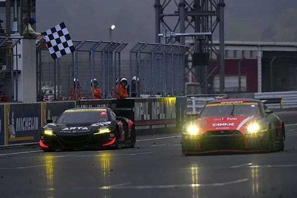 GT300组别方面,平中克幸/安田裕信车组驾驶的11号GAINER TANAX GT-R在最后时刻抵住了高木真一/福住仁嶺车组55号ARTA NSX GT3的猛攻,拿下头名。