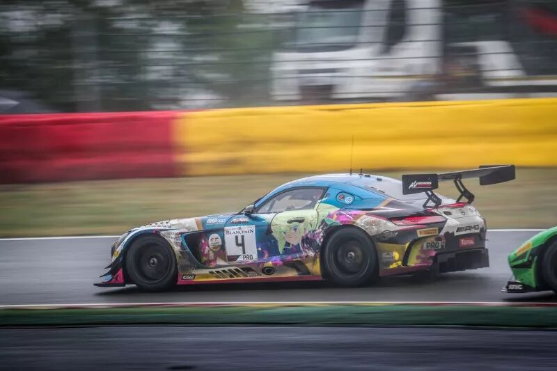 Black Falcon车队以“奸笑社”《PROMARE》痛车涂装的4号梅赛德斯-AMG GT3从杆位出发,整场比赛都相当具备竞争力且始终处在争冠集团当中,可惜Maro Engel/Luca Stolz/Yelmer Buurman车组在最后阶段不敌保时捷大军的追击,三人收获全场颁奖台的最后一个位置。