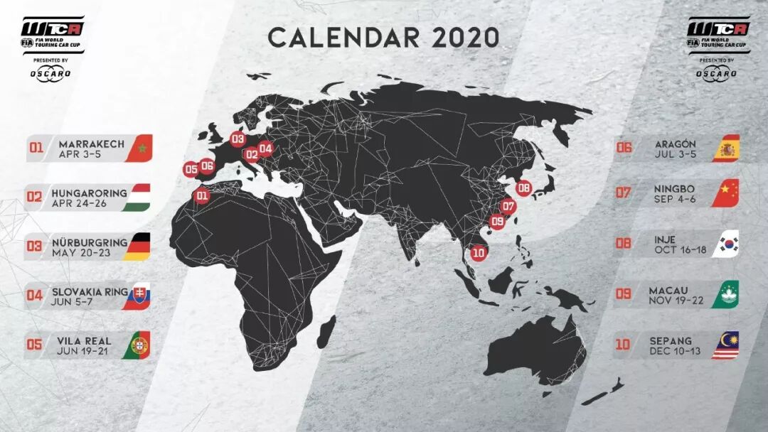 和今年一样,2020赛季WTCR将继续维持在10个分站,但当中的部分分站有所调整。欧洲方面西班牙阿拉贡赛道(Motorland Aragón)将取代荷兰的赞德沃特站,而亚洲区域中日本铃鹿将不会回归,取而代之的是韩国仁济赛车场(Inje-Speedium)。WTCR第三赛季的比赛将和之前两年一样,在摩洛哥马拉喀什街道揭幕。