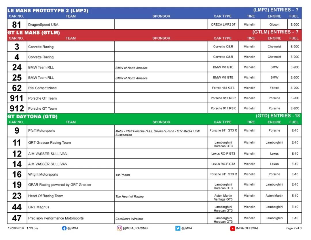 DPi、LMP2、GTLM及GTD组别一共有40辆赛车参加这次的比赛,其中DPi赛车8辆、LMP2赛车7辆,GTLM组别赛车7辆,GTD组别赛车18辆。DPi组别中仅剩下凯迪拉克、讴歌及马自达三家厂商的赛车,今年的全场冠军得主凯迪拉克DPi-V.R在组别内占据半数,其车重比今年戴通纳时增加20kg达到了950kg,但进气限流阀也被放宽了0.3mm(约增加6马力);马自达RT24-P被增重5kg,讴歌ARX-05 DPi跟今年相比没有变化。LMP2组别中仅有一辆Riley MK.30,其余赛车全部为ORECA 07。