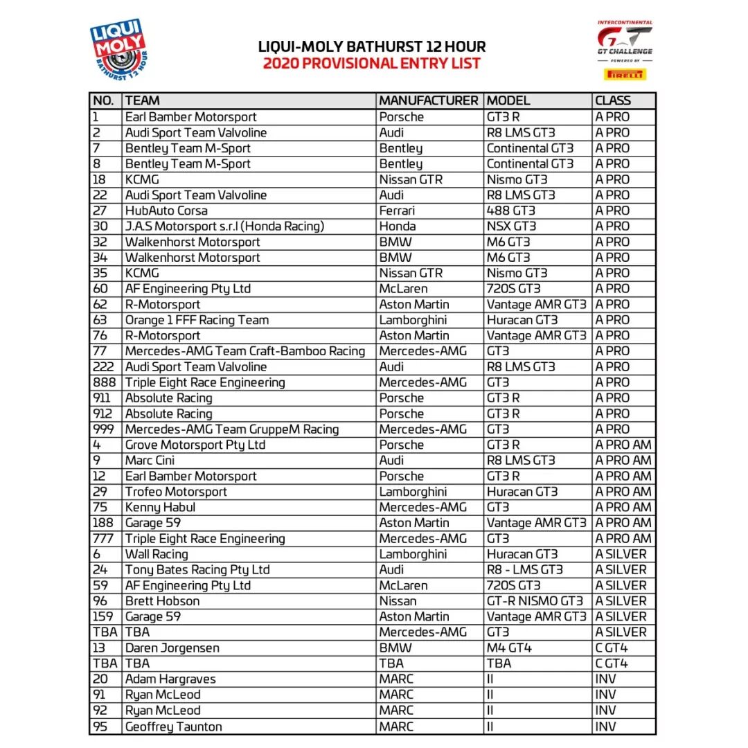 2020年巴瑟斯特12小时耐力赛初步参赛名单