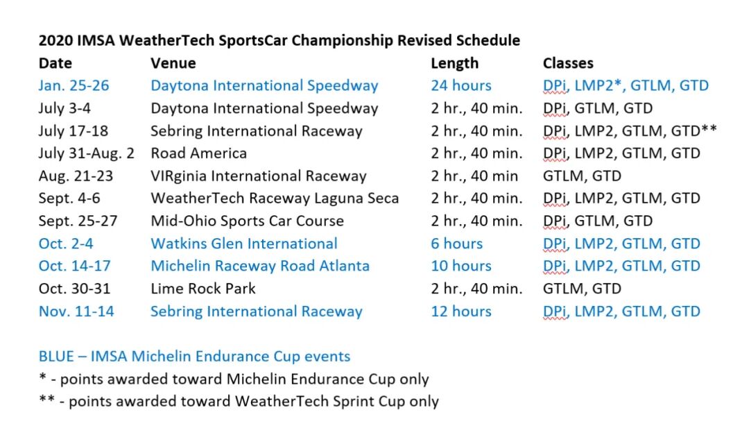 IMSA WeatherTech跑车锦标赛将于7月恢复赛事,年初揭幕战戴通纳24小时耐力赛后的首场比赛将于7月3-4日再次回到戴通纳国际赛车场进行,不过赛事形式将是2小时40分钟的冲刺赛。接着7月17-18日,第三站赛事将移师赛百灵国际赛车场进行,不过两场赛事都不会向公众开放。7月戴通纳站至11月11-14日进行的收官战赛百灵12小时耐力赛期间,IWSC将计划举办10个分站的赛事。2020赛季改版赛历如下: