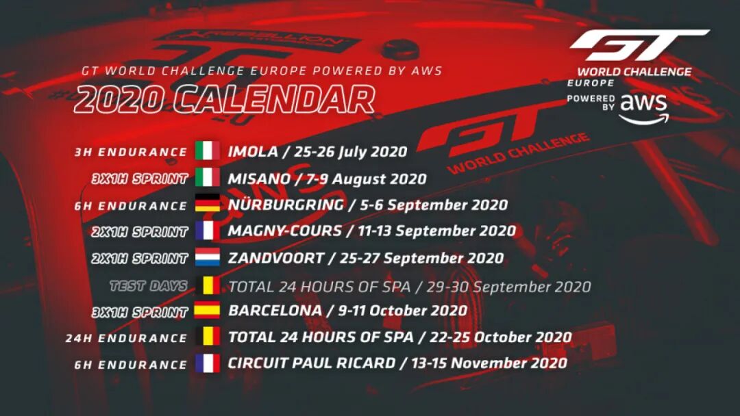 SRO赛车集团计划于7月下旬重启GT世界挑战赛欧洲杯(GTWCE)赛季,更新后的赛程中共包含8个分站(耐力杯及冲刺杯各4个分站),冲刺杯4个分站意大利米萨诺、法国马尼库尔、荷兰赞德沃特以及西班牙巴塞罗那站的比赛中面向绅士车手的GT Sports Club Europe赛事(向GT3及GT2规格赛车开放)将同场竞技。首站比赛将于伊莫拉赛道展开3小时的耐力赛。赛事将从7月末持续至11月中旬,收官战设置在法国保罗·里卡德赛道。2020赛季改版赛历如下: