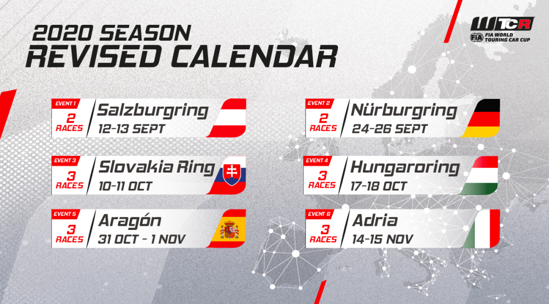 WTCR计划于9月12-13日在奥地利萨尔斯堡赛道开启本赛季的比拼,相比原计划中的10个分站,修改后的赛历中将只剩下6个欧洲分站。在完成奥地利站的比赛之后,WTCR将先后回归德国纽伯格林、斯洛伐克环及匈牙利亨格罗林,西班牙阿拉贡赛道将在11月初担任赛季的倒数第二站比赛,赛季将于11月14-15日在意大利阿德里亚赛道迎来收官。六个分站中前两个分站将进行两回合决赛,而后四个分站都将进行三回合决赛,整个赛季总共将逐出十六座单回合冠军奖杯。