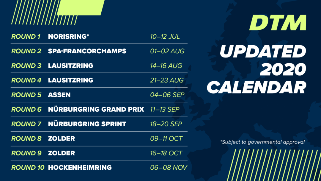 2020赛季DTM德国房车大师赛将于8月1-2日于比利时斯帕赛道揭幕。虽然改版赛历中首站比赛于7月10-12日设置在诺里斯林街道赛道,但由于办赛申请未能得到当地政府的同意,因此第二站比利时斯帕站将成为本赛季的揭幕战。8月份,DTM将在劳希茨林连赛两场,随后9月转战荷兰阿森及德国纽伯格林,10月迎接比利时佐尔德双赛,最后于11月6-8日在德国霍根海姆迎接收官。