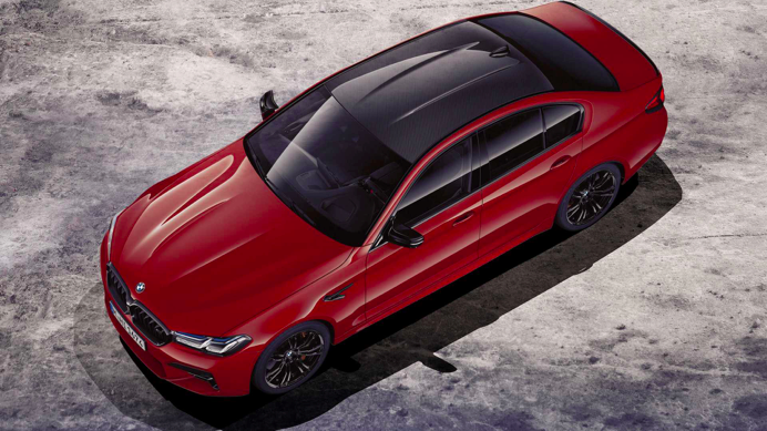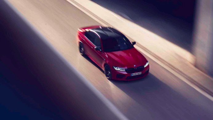 本次改款,宝马首先献上外观和内饰的升级。新款M5沿用改款普通5系的设计语言,同时进一步强调运动气息。双L造型的LED日间行车灯是紧随普通5系改款的升级;前保险杆与格栅上更大的开口、黑色的后视镜、前中网、尾标以及碳纤维增强复合材料车顶等细节则是性能车身份的体现。