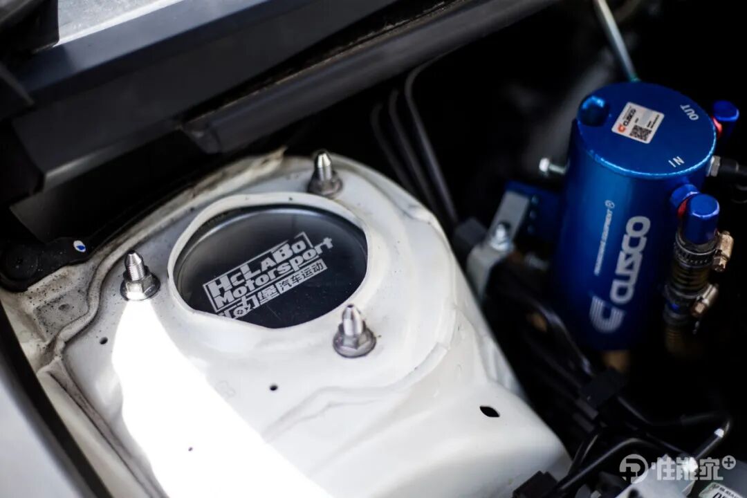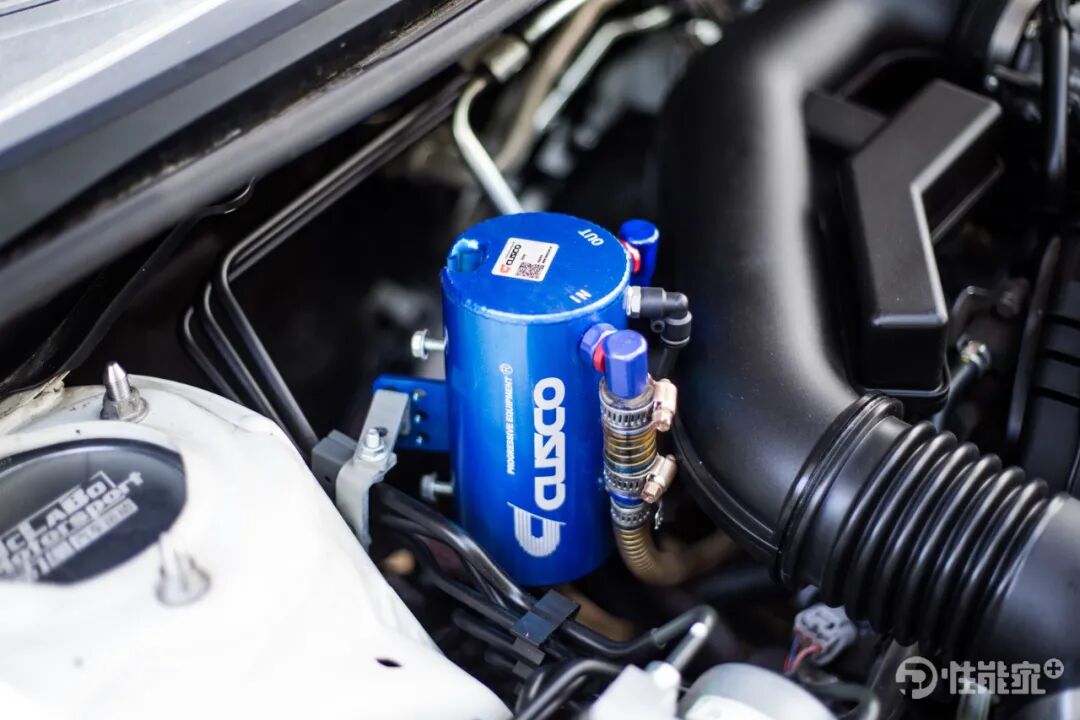机舱内升级了来自CUSCO的刹车顶和机油透气壶,有了刹车顶的额外固定,在深踩刹车踏板时可以减小防火墙在刹车过程中的变形,以此换来更好的刹车脚感,以及提高刹车控制的精准度。机油透气壶可以收集发动机多余的机油蒸汽加以处理,让机油蒸汽不会再次进入进气歧管参与燃烧,保证发动机在高负荷运转之后依然表现出色.