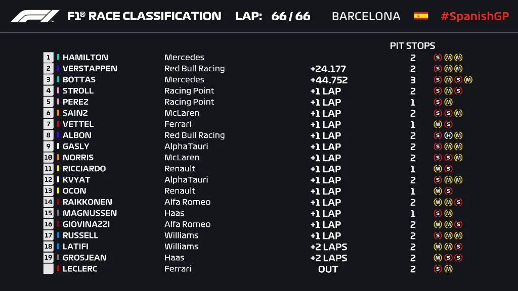 迈凯伦车手卡洛斯赛恩斯收获第六,而当选全场最佳车手的塞巴斯蒂安·维特尔采用一停策略用红色软胎换下黄色中性胎,死守36圈拿下第七,从第十一名发车的四届世界冠军成为了唯一一位完赛的法拉利车手,比赛过程中他与车队的尴尬沟通令人唏嘘。其队友夏尔·勒克莱尔遭遇赛车电子系统故障引发的引擎熄火,成为了本站比赛唯一一位退赛的车手。