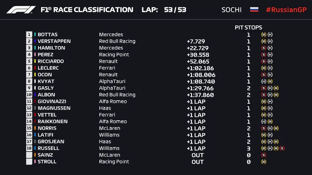 F1俄罗斯大奖赛,梅赛德斯车队依旧在这座赛场所向披靡,续写着不败神话,只不过这一场比赛的主角终于又轮到了芬兰人瓦尔特利·博塔斯。积分榜领跑者刘易斯·汉密尔顿本场比赛再次从杆位出发并在不利条件下守住领先优势,但由于受车队指示于赛前在错误的位置练习起步,这一事件让他领到累计加罚十秒的“牛肉干”,受罚后只能最后追到季军位置完赛。受益于队友汉密尔顿的处罚,博塔斯轻松夺得本赛季第二场胜利,红牛主将麦克斯·维斯塔潘收获亚军。