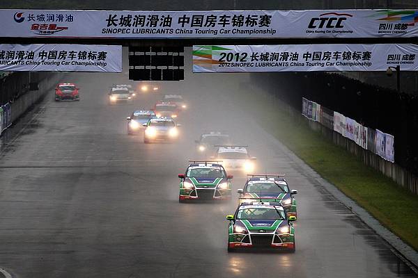 周日早上,成都赛车场就开始大雨纷飞,场外场内布满积水。赛会出于安全考虑,采取安全车带领车群以滚动发车的形式开展,而这个形式延续了2011年的发车方式,成都的CTCC依旧延续了雨战的传统。