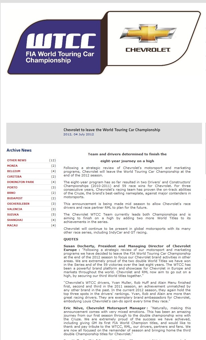 附原文链接:http://www.chevroletwtcc.com/news/2012/chevrolet-to-leave-the-world-touring-car-championship/