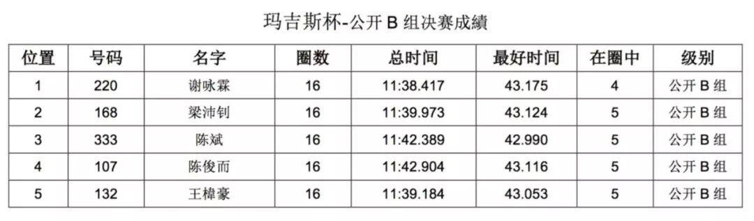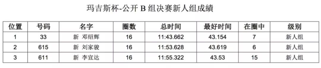为了吸引更多的新人车手参与到专业赛事中,在公开B组参赛的35位车手中有18位属于新人组,由邓绍辉获得冠军、刘家骏获得亚军、李宣达获得季军。