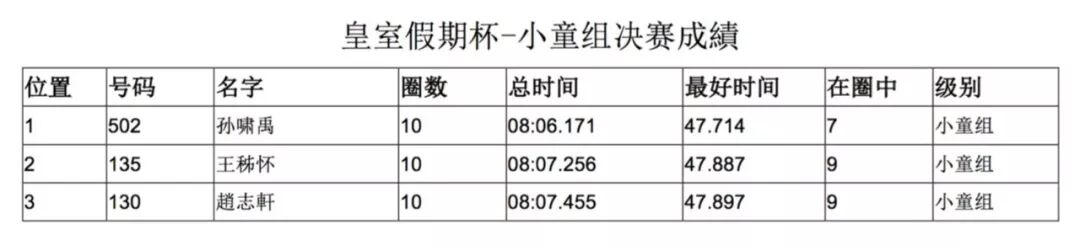 各位小车手经过激烈的赛事比拼,孙啸禹获得该组别冠军、王秭怀和赵志轩分列亚季军。