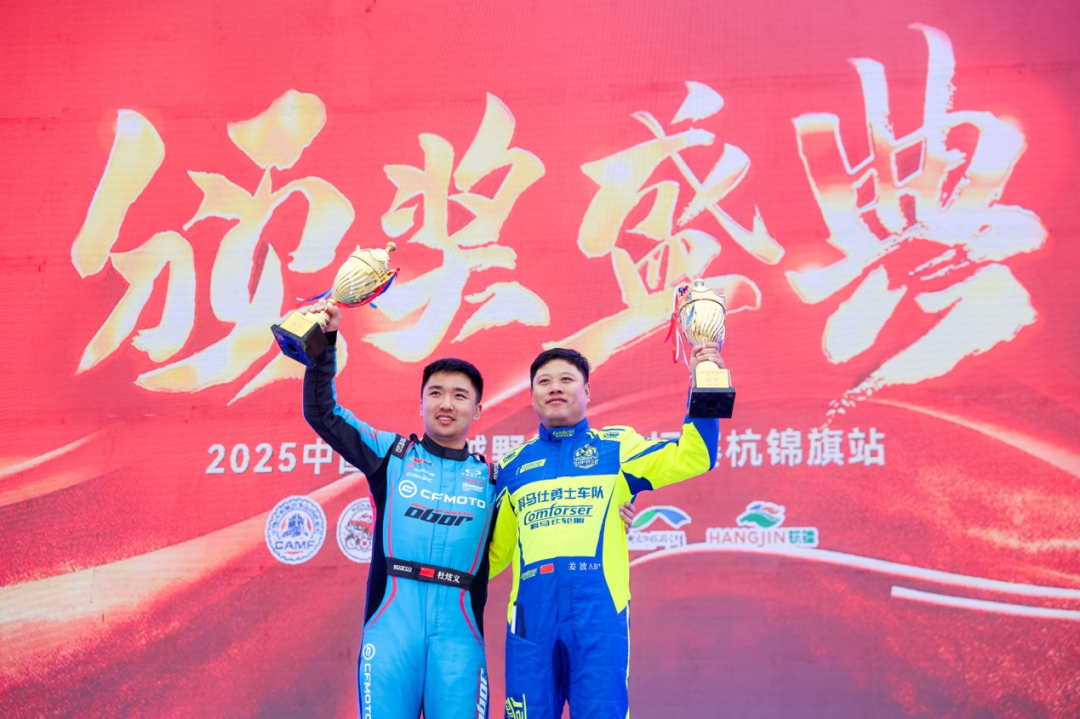改装组决赛,CFMOTO春风动力的杜炫义延续火热状态,发车后便迅速拉开差距,几乎以“一骑绝尘”之势领跑全程,最终以2分45秒05的成绩毫无悬念夺得冠军。来自车仆车队的赵福强则稳扎稳打,牢牢守住第二名位置,展现出扎实的节奏掌控能力。领奖台最后一席的争夺异常激烈,吕京科与王圣博在赛程中多次上演近身缠斗,最终吕京科凭借更为稳定的节奏力压对手,以2分58秒54的成绩拿下第三名,王圣博位列第四。