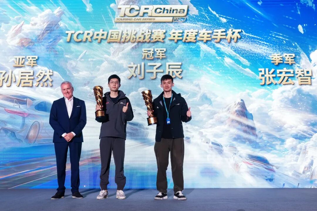 中国汽车摩托车运动联合会主席詹郭军为TCR中国锦标赛年度车手杯冠亚季军颁奖